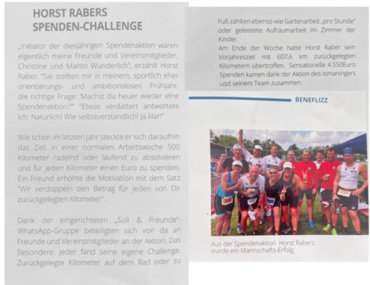 Mit viel Schweiß haben die Trisharks des SV Solidarität Ismaning „Unsere Herzensangelegenheit – Hubert und Renate Schwarz-Stiftung“ unterstützt. Wie ihr euch sicher noch erinnert, hat unser Spartenleiter Horst Raber eine Spenden-Challenge mit den Solis für die Hubert-Schwarz-Stiftung organisiert. Wir haben es geschafft mit 607,6 km insgesamt 4.550,00 € zu spenden. Dafür bekamen wir einen Platz…
