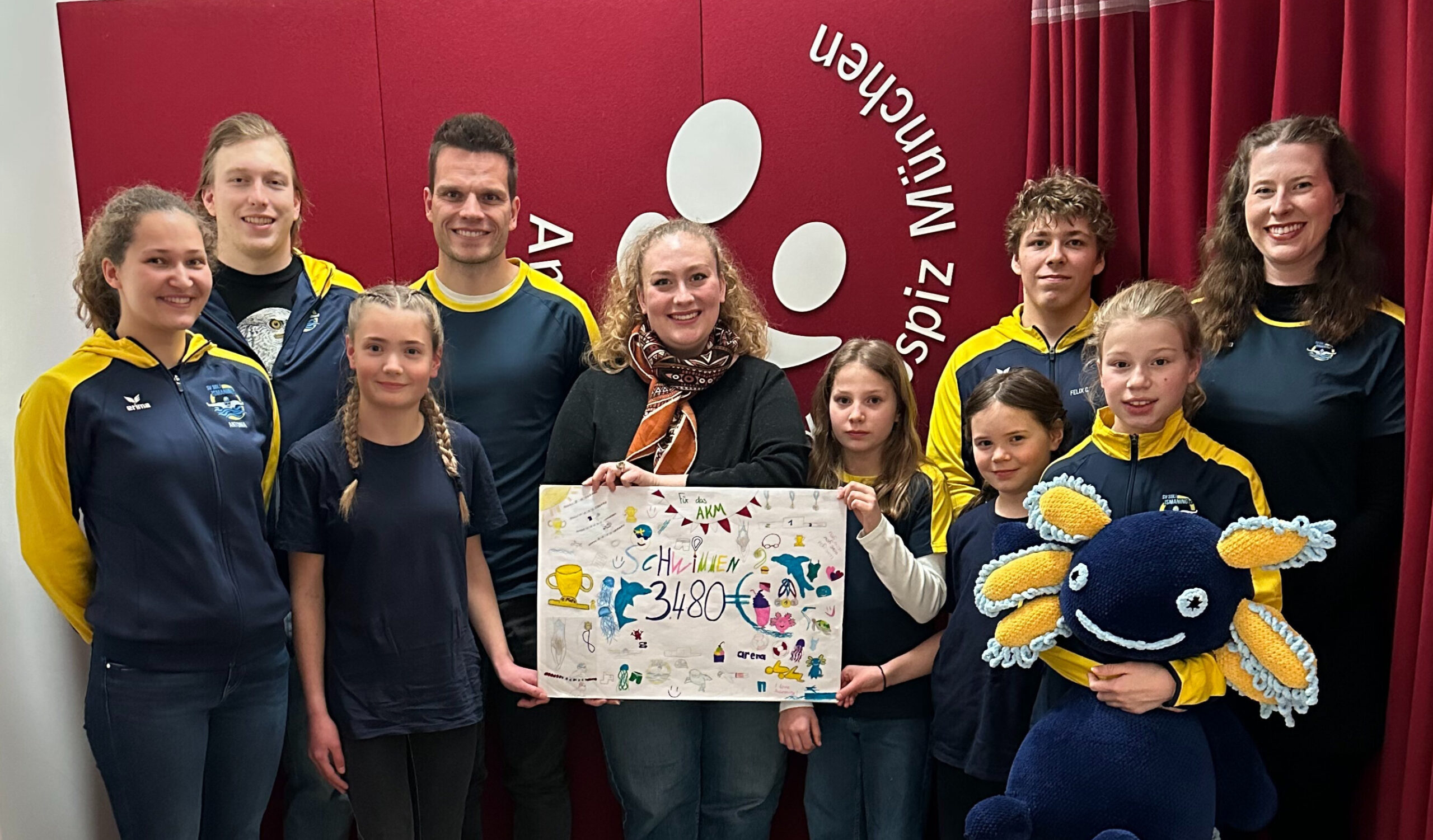 In der Woche versuchten wir gemeinsam, im Training möglichst viel zu schwimmen – insgesamt sind unsere Schwimmerinnen und Schwimmer über 140.000 Meter geschwommen und haben eine Summe von insgesamt 6.960€ erschwommen. Am 29.01. erfolgte die offizielle Spendenübergabe an das AKM, welche sich sehr beeindruckt zeigten über die hohe Spendensumme sowie den sehr kreativ gestalteten Spendenscheck. Mit der Spendensumme in Höhe von 3.480€ können sie eine Familie ein halbes Jahr lang unterstützen.